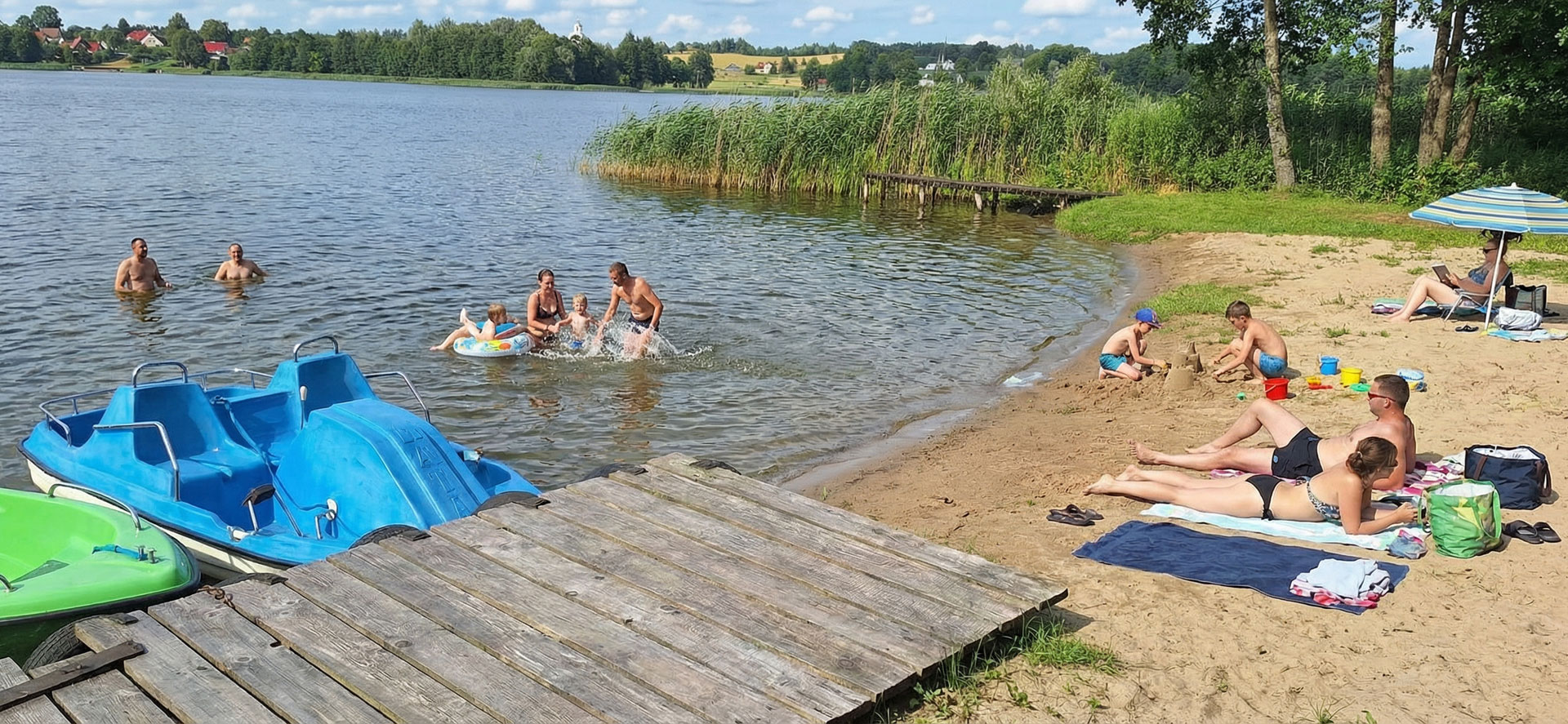 Posiadamy osobną plażę z pomostem, gdzie miło spędzicie czas na wędkowaniu, kąpieli lub opalaniu.